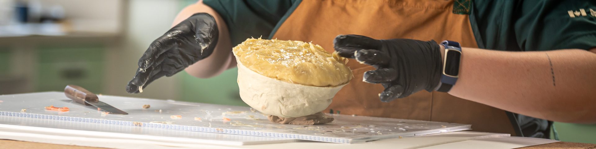 Cindy Lee Scott, superviseure de la reproduction d'artéfacts à Parcs Canada, applique le moule mère pour un moule en silicone destiné à la reproduction d'un objet.