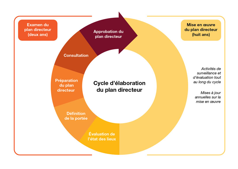 - Le processus d’examen (deux ans) et de mise en œuvre (huit ans) du plan directeur est un cycle continu d’activités de mobilisation, de prise de décisions, d’évaluation et de production de rapports.