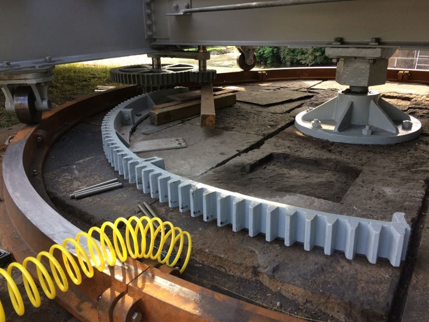 Dans les deux dernières semaines, l’entrepreneur a terminé les réparations du revêtement de protection du pont, a installé le tablier de bois, a réinstallé des composantes mécaniques et a terminé d’autres réparations à la maçonnerie en pierre historique.