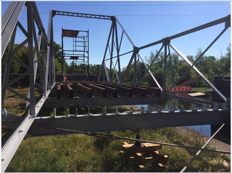 Au cours des dernières semaines, on a rapporté le pont à son emplacement et on l’a réassemblé en grande partie, y compris les pièces de pont et les poutres transversales supérieures. On a mis en oeuvre des longerons en bois et commencé la mise en place des contrepoids.