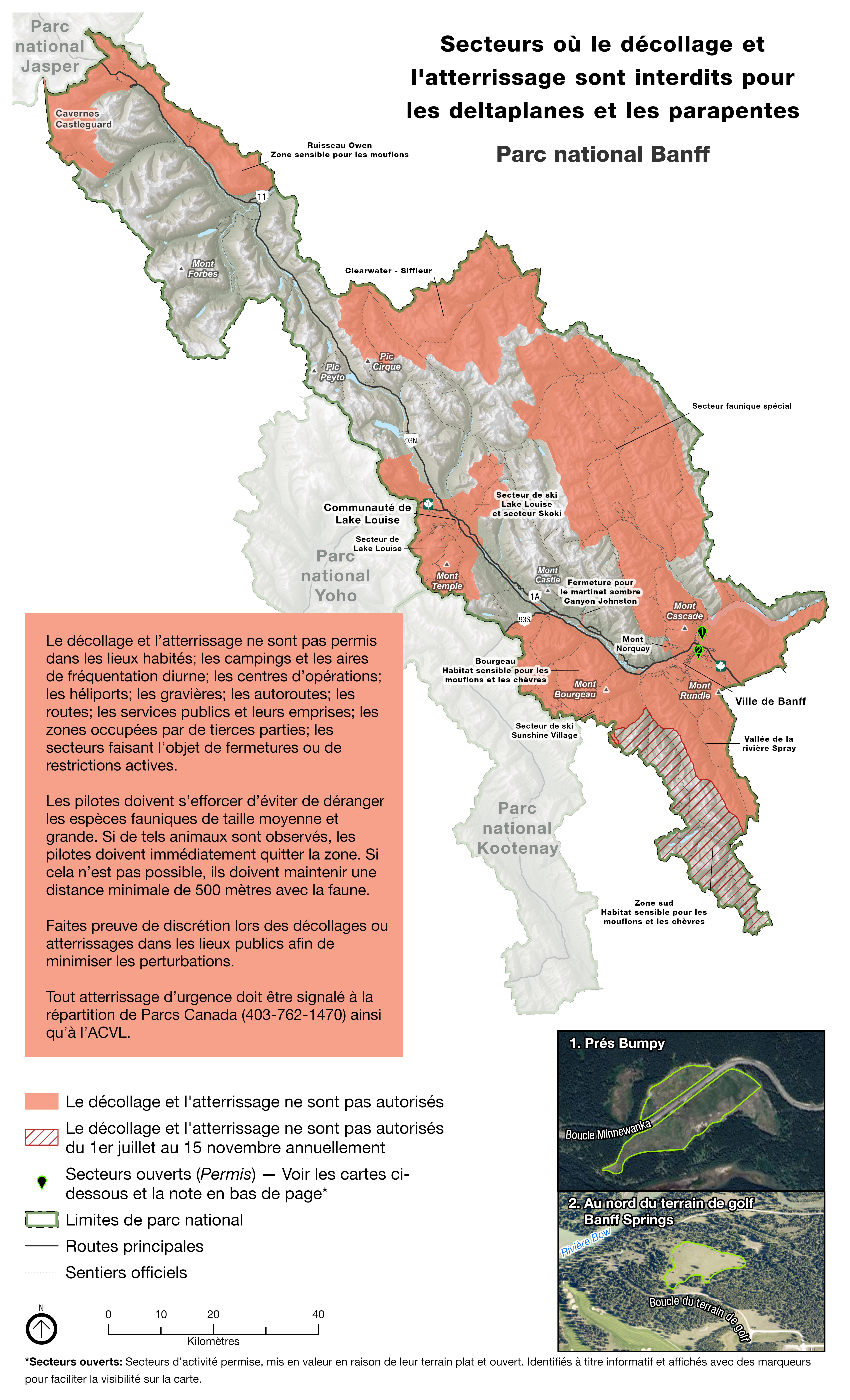Parcs Canada a délimité des secteurs à l’intérieur du parc national Banff où le décollage et l’atterrissage de parapentes et de deltaplanes sont interdits en raison de la présence de zones écologiques fragiles, d’animaux sauvages et d’aires très fréquentées par les visiteurs ainsi que pour des raisons de sécurité publique.