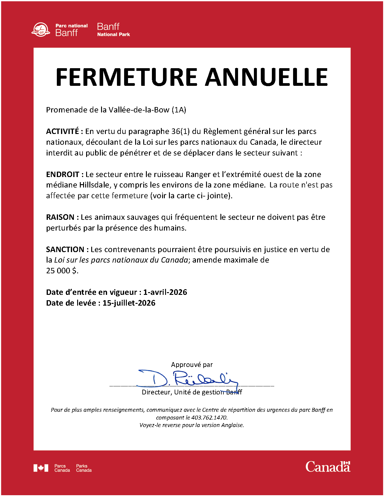 ACTIVITÉ : En vertu du paragraphe 36(1) du Règlement général sur les parcs nationaux, découlant de la Loi sur les parcs nationaux du Canada, le directeur interdit au public de pénétrer et de se déplacer dans le secteur suivant :