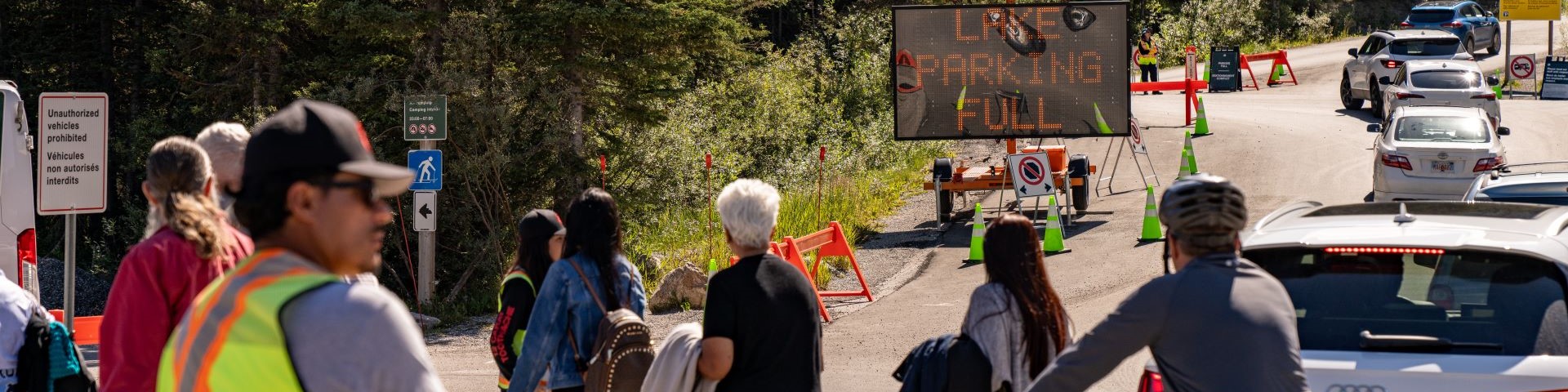 La demande d’accès au lac Moraine dépasse largement la capacité du stationnement. Au plus fort de l’été 2022, la plupart des automobilistes qui ont tenté de se rendre au lac Moraine ont été refoulés, et le stationnement est resté plein presque jour et nuit. Il a fallu affecter des contrôleurs de la circulation 24 heures sur 24 pour gérer la demande d’accès.