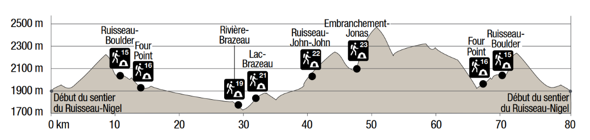 - Sur le premier tronçon de 10,7 km, le sentier grimpe au-dessus du col Nigel (2 195 m) avant de redescendre au camping du Ruisseau-Boulder (2 036 m).