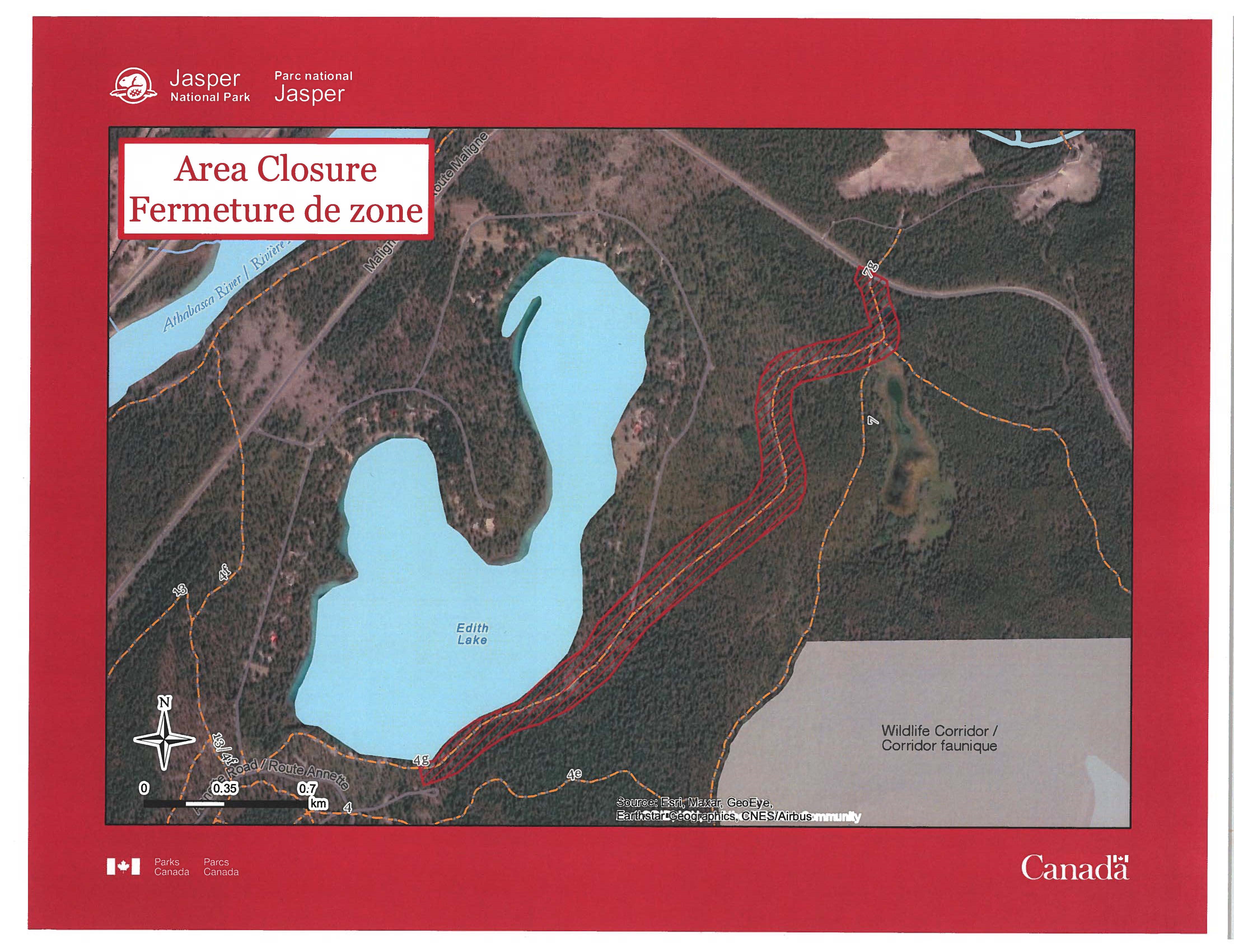 Le secteur situe le long du sentier no 4g, le sentier du Lac-Edith, qui s'etend vers la route du Lac-Maligne, y compris les raccordements avec les sentiers no7 et 7g. Cette fermeture s'etend sur 30 m des deux cotes des sentiers susmentionnes. Veuillez consulter la carte pour une representation graphique du secteur ferme.