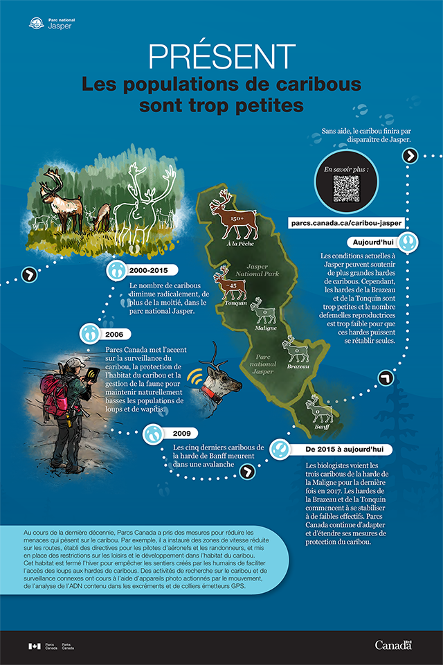 Au cours de la dernière décennie, Parcs Canada a pris des mesures pour réduire les menaces qui pèsent sur le caribou. Par exemple, il a instauré des zones de vitesse réduite sur les routes, établi des directives pour les pilotes d’aéronefs et les randonneurs, et mis en place des restrictions sur les loisirs et le développement dans l’habitat du caribou. Cet habitat est fermé l’hiver pour empêcher les sentiers créés par les humains de faciliter l’accès des loups aux hardes de caribous. Des activités de recherche sur le caribou et de surveillance connexes ont cours à l’aide d’appareils photo actionnés par le mouvement, de l’analyse de l’ADN contenu dans les excréments et de colliers émetteurs GPS.