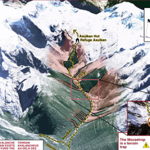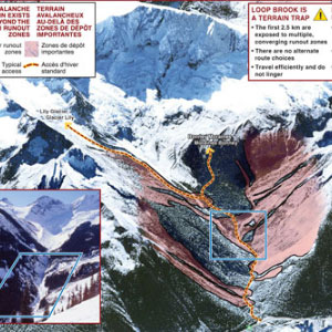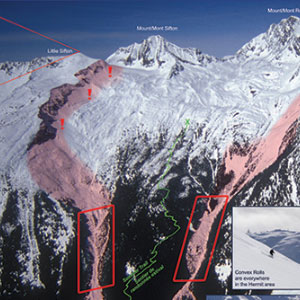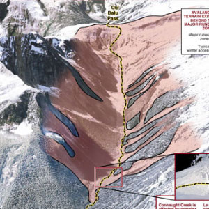Ces cartes présentent les principales zones de dépôt d’avalanche ainsi que les pièges naturels dans cinq zones de ski de randonnée prisées au col Rogers.
