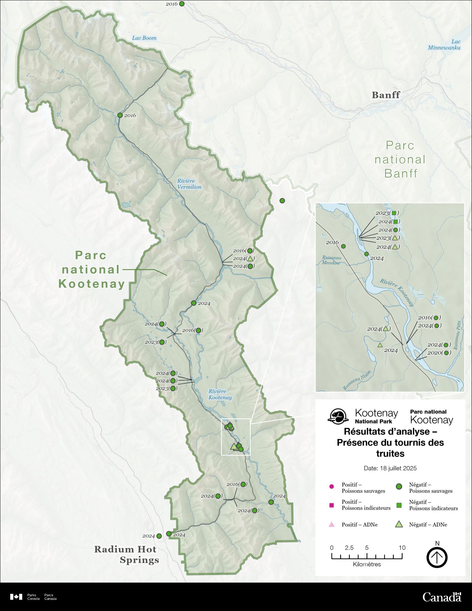 Toutes les analyses réalisées en 2024 pour déceler la présence du tournis des truites dans le parc national Kootenay ont produit des résultats négatifs. Ces analyses confirment donc que la maladie reste absente du parc.