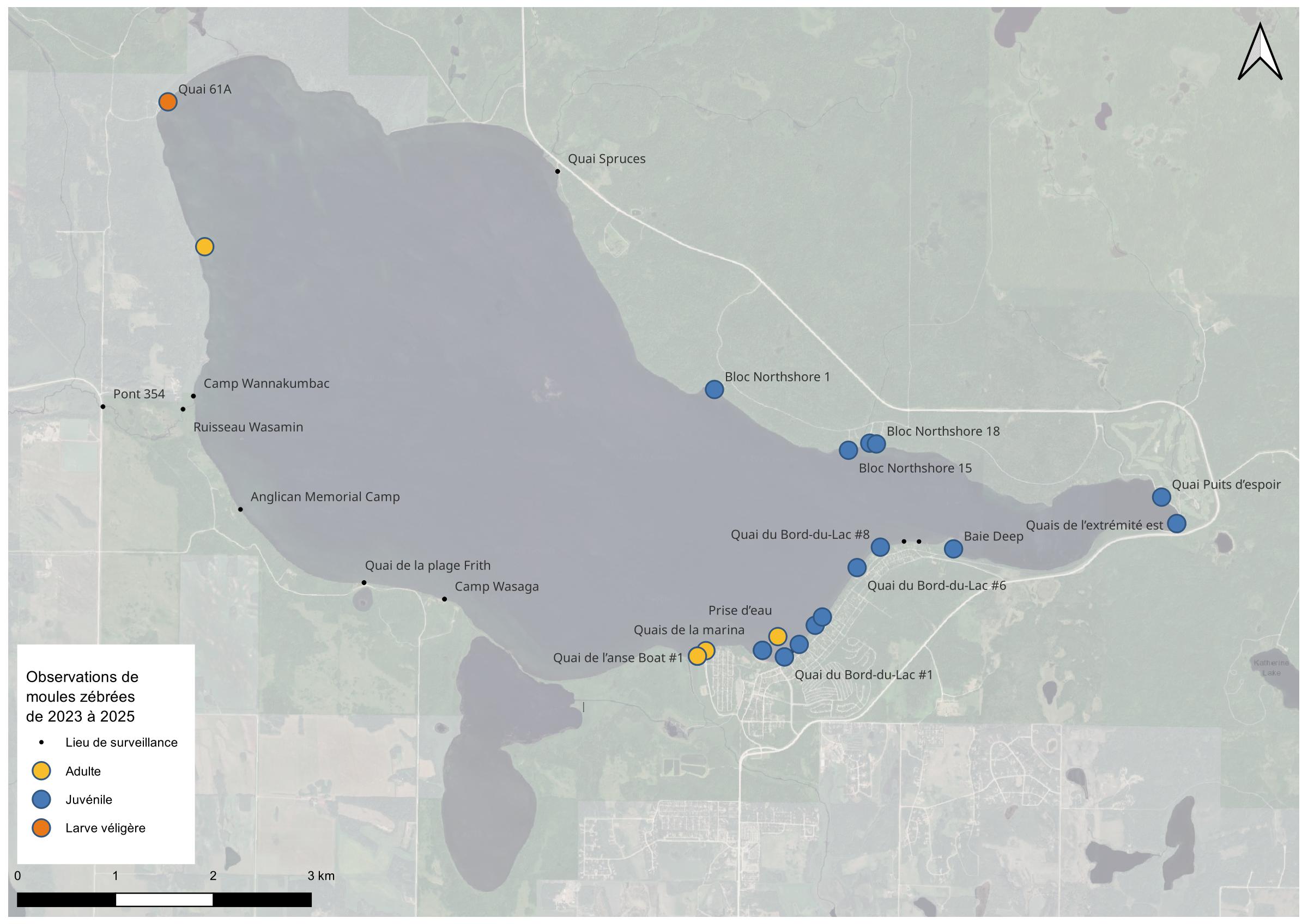 Carte de tous les endroits où l’on a observé la présence de moules zébrées dans le lac Clear de 2023 à 2025