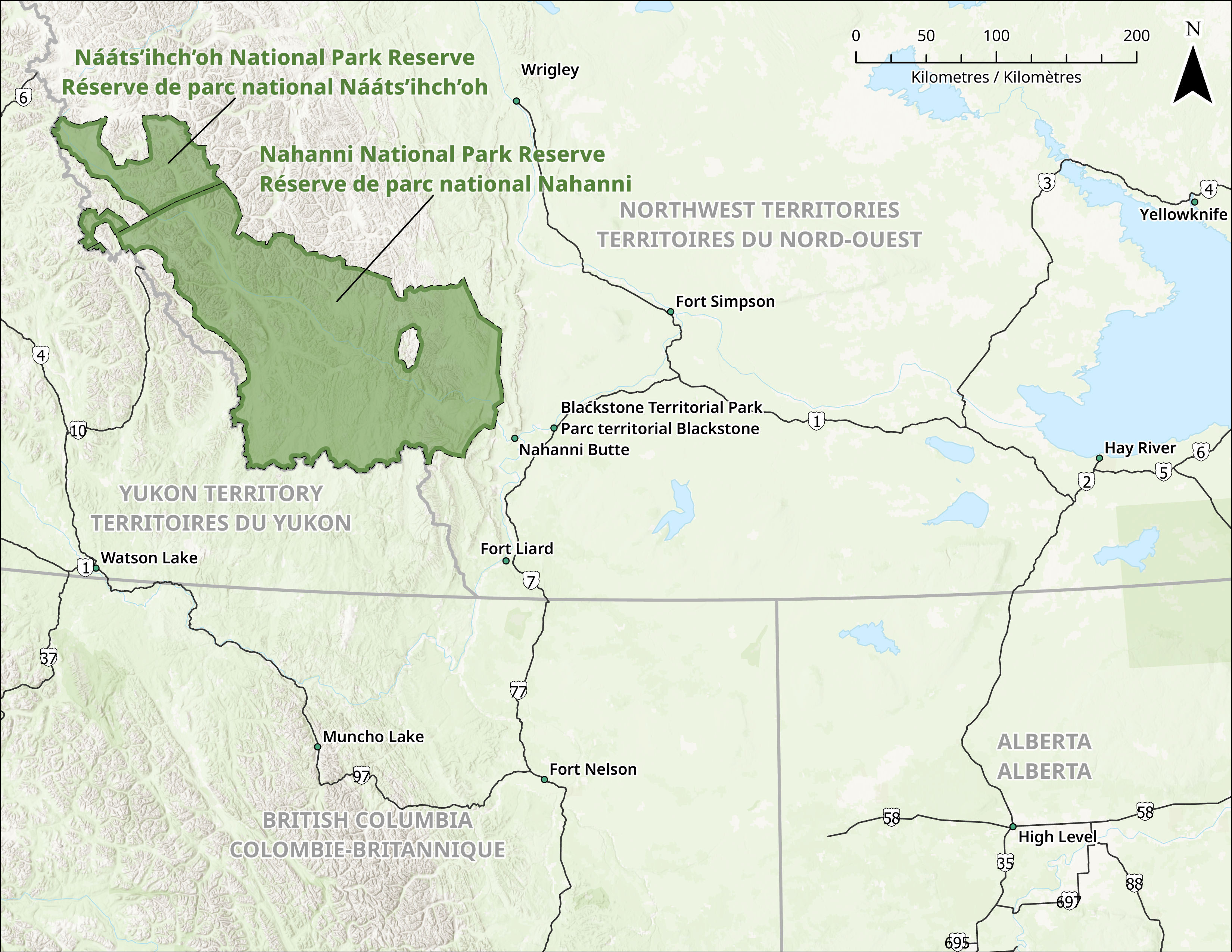Même s’il n’y a pas de route publique dans la réserve de parc national Nahanni, plusieurs routes difficiles donnent accès au parc. Il est possible d'atteindre le haut de la rivière Nahanni Sud au Marais Moose (à l’extérieur de la réserve de parc) en traversant la ligne continentale de partage des eaux depuis le Yukon. Certains se rendent à la rivière Nahanni Sud en conduisant jusqu'à l'ancienne ville minière de Tungsten depuis Watson Lake, au Yukon. La route qui mène à Tungsten n'est pas régulièrement entretenue et elle est souvent impraticable. Lorsqu'elle est praticable, il faut un véhicule à quatre roues motrices (4 x 4) pour se rendre jusqu'à Tungsten. De Tungsten, les voyageurs ont le choix d'emprunter la Petite rivière Nahanni ou la rivière Flat pour atteindre la rivière Nahanni Sud. La Petite rivière Nahanni et la rivière Flat comptent toutes deux des rapides de catégorie IV et V. Les pagayeurs inexpérimentés ne devraient pas s'y aventurer.