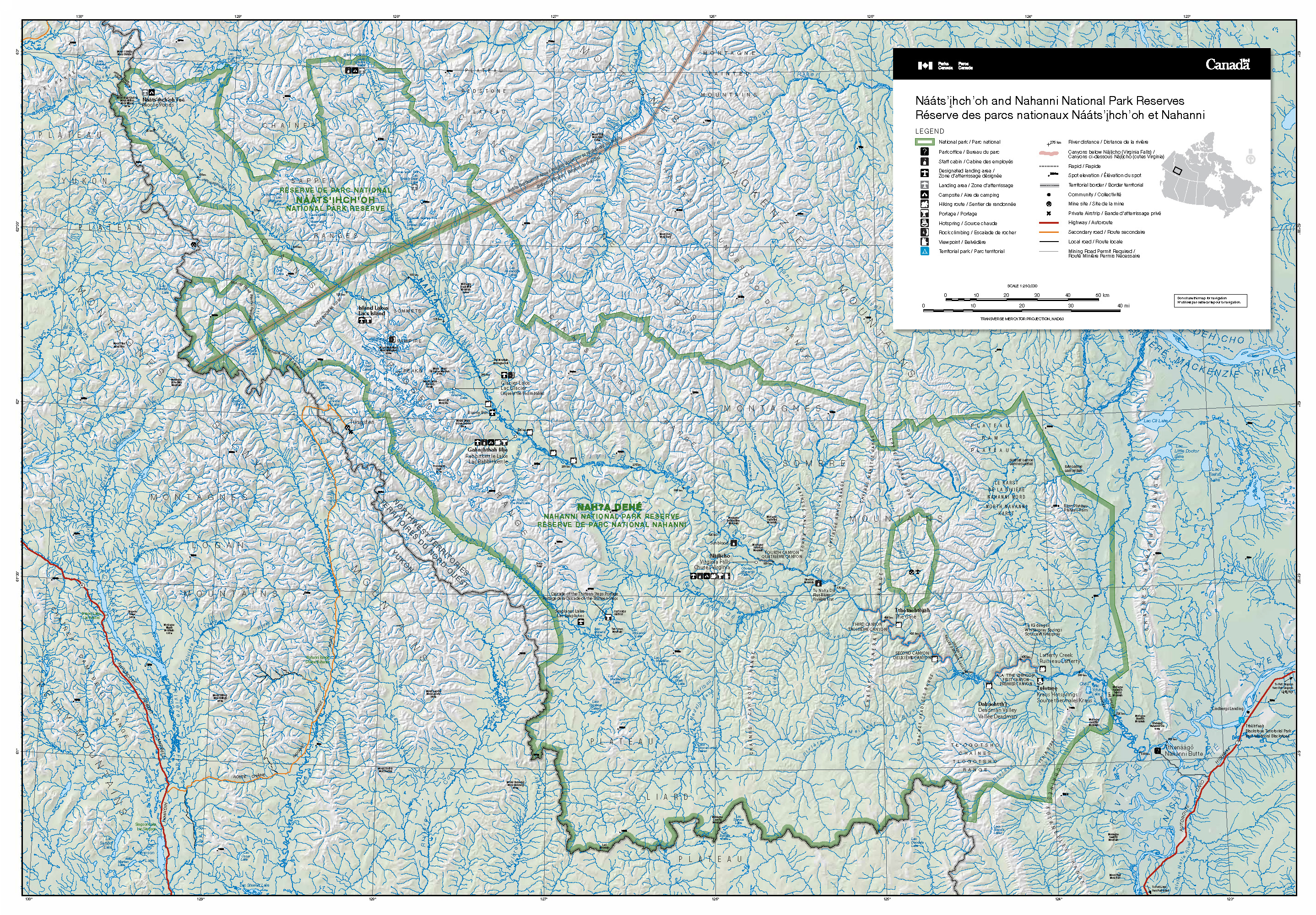 Náįlįcho (La chute Virginia), le lac Glacier, Bunny Bar, le Lac Island, le lac Honeymoon, le lac Seaplane et Gahnįhthah Mie (le lac Rabbitkettle) sont les seules aires d’atterrissage désignées de la réserve de parc national Nahanni.