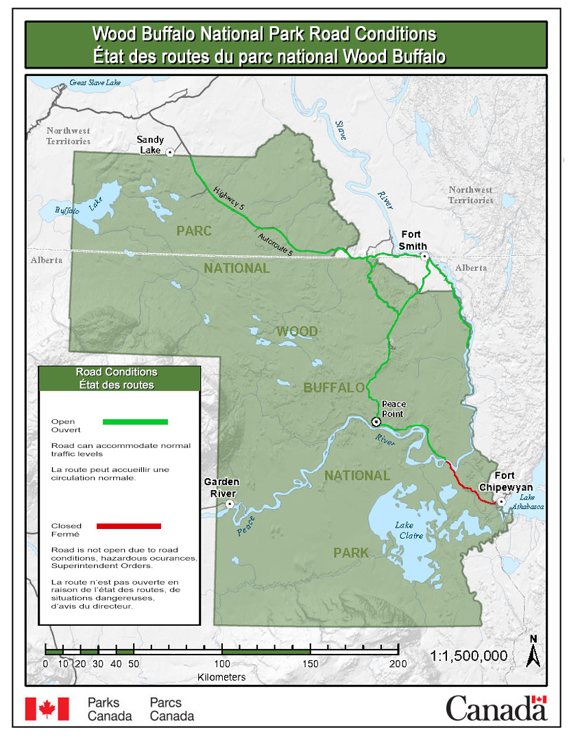 Obtenez de plus amples renseignements sur l’état des routes dans le parc en téléphonant au centre d’accueil du parc national Wood Buffalo au 1-867-872-7960 ou en envoyant un courriel à woodbuffaloinfo-infowoodbuffalo@pc.gc.ca.
