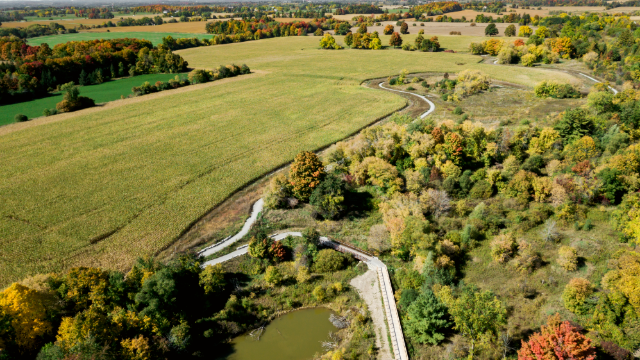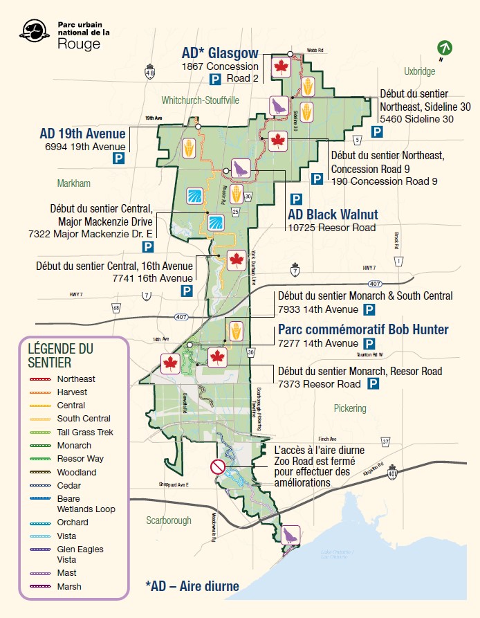Optionnel : Pour une randonnée plus courte, faites demi-tour au stationnement de la promenade Major Mackenzie. Si vous souhaitez prolonger votre sortie, poursuivez vers le sud le long du sentier Central en direction de Reesor Road ou revenez par les sentiers de liaison. Pensez à vous arrêter à un étal de produits agricoles à proximité pour des fruits et légumes frais ou des gourmandises d’automne sur le chemin du retour.