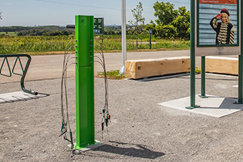 Tandis que Parcs Canada travaille à la construction et à l’amélioration des aires de fréquentation diurne dans le parc urbain national de la Rouge, diverses initiatives durables ont été intégrées. Des supports pour vélos et des stations de réparation ont été installés dans deux nouvelles aires de fréquentation diurne afin de promouvoir le transport actif vers le parc et de compléter les nouveaux sentiers à usages multiples. Des poubelles à l’épreuve des animaux sauvages ont été installées au nord de l’avenue Steeles pour garantir que les déchets sont éliminés correctement et ne sont pas ingérés par les animaux sauvages. L’éclairage de sécurité de tous nos stationnements situés au nord est également alimenté par l’énergie solaire. En outre, des stations de recharge d’appareils électroniques fonctionnant à l’énergie solaire ont également été installées au terrain de camping Glen Rouge.