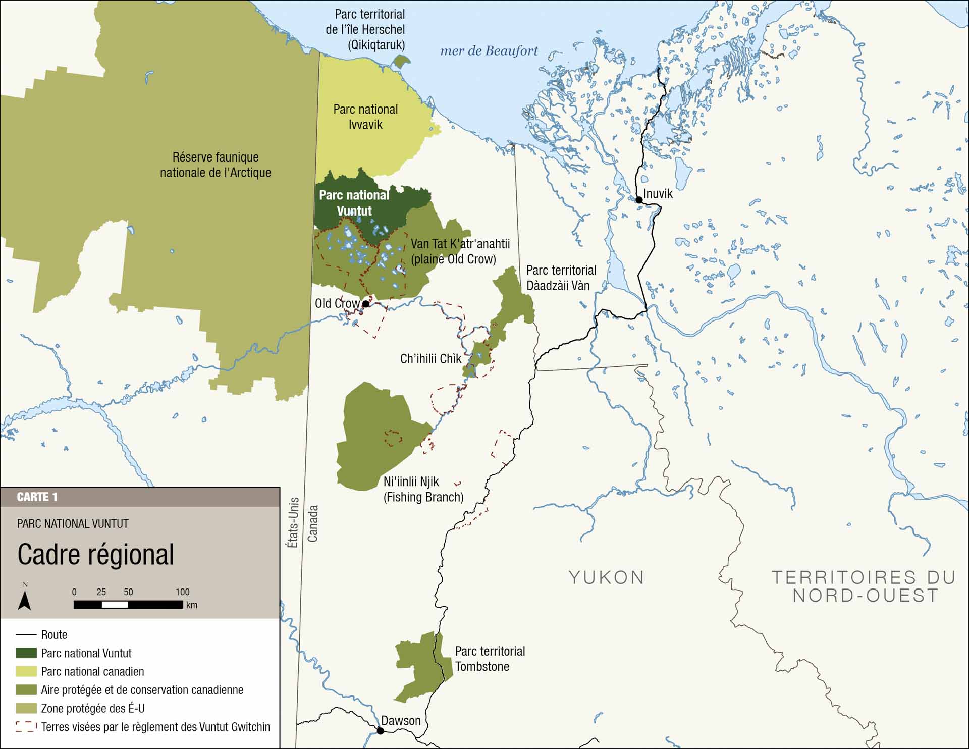 Cette carte présente le cadre régional du parc national Vuntut dans le nord du Yukon, entre l’Alaska et les Territoires du Nord-Ouest. Le parc est compris dans la zone spéciale de gestion de la plaine Old Crow et est limitrophe au parc national Ivvavik au nord et à la réserve faunique national de l’Arctique en Alaska à l’ouest. La carte contient une légende dans le coin inférieur droit avec une échelle de 0 à 100 kilomètres.