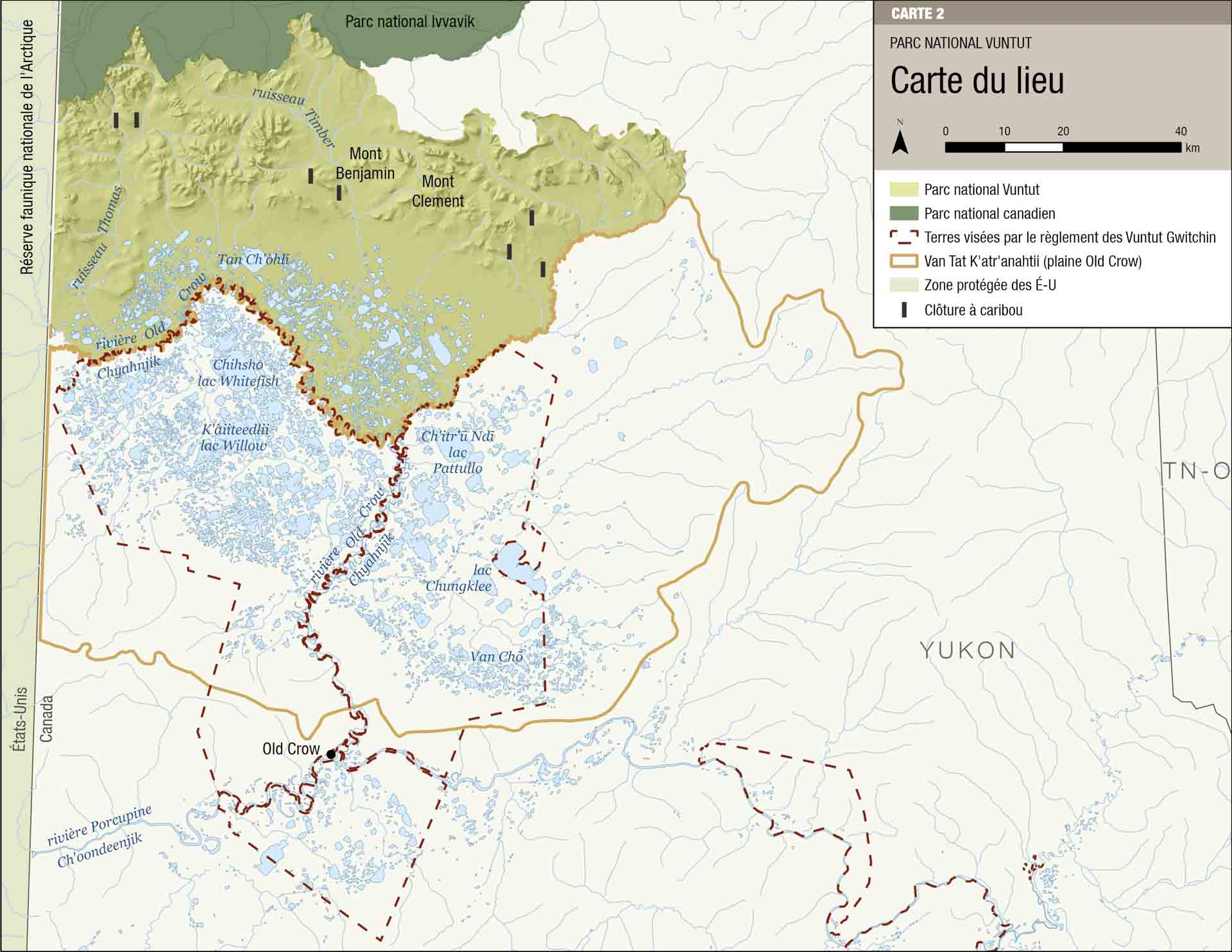 Vuntut zit nan thok natr'ininn'aii, le nom gwich'in du parc national Vuntut, est un élément central du territoire ancestral de la Première Nation des Gwitchin Vuntut. D'une superficie de 4 345 kilomètres carrés, le parc se trouve sur les terres ancestrales des Gwitchin Vuntut – également connus sous le nom de « peuple des lacs » – dans la région nord-ouest du Yukon (carte 1). Il fait partie de la zone spéciale de gestion de la plaine Old Crow et borde le parc national Ivvavik au nord, et la réserve faunique nationale de l'Arctique, en Alaska, à l'ouest. Aux fins du présent document, « Vuntut zit nan thok natr'ininn'aii» et « le parc » seront utilisés de manière interchangeable pour désigner le parc national Vuntut.