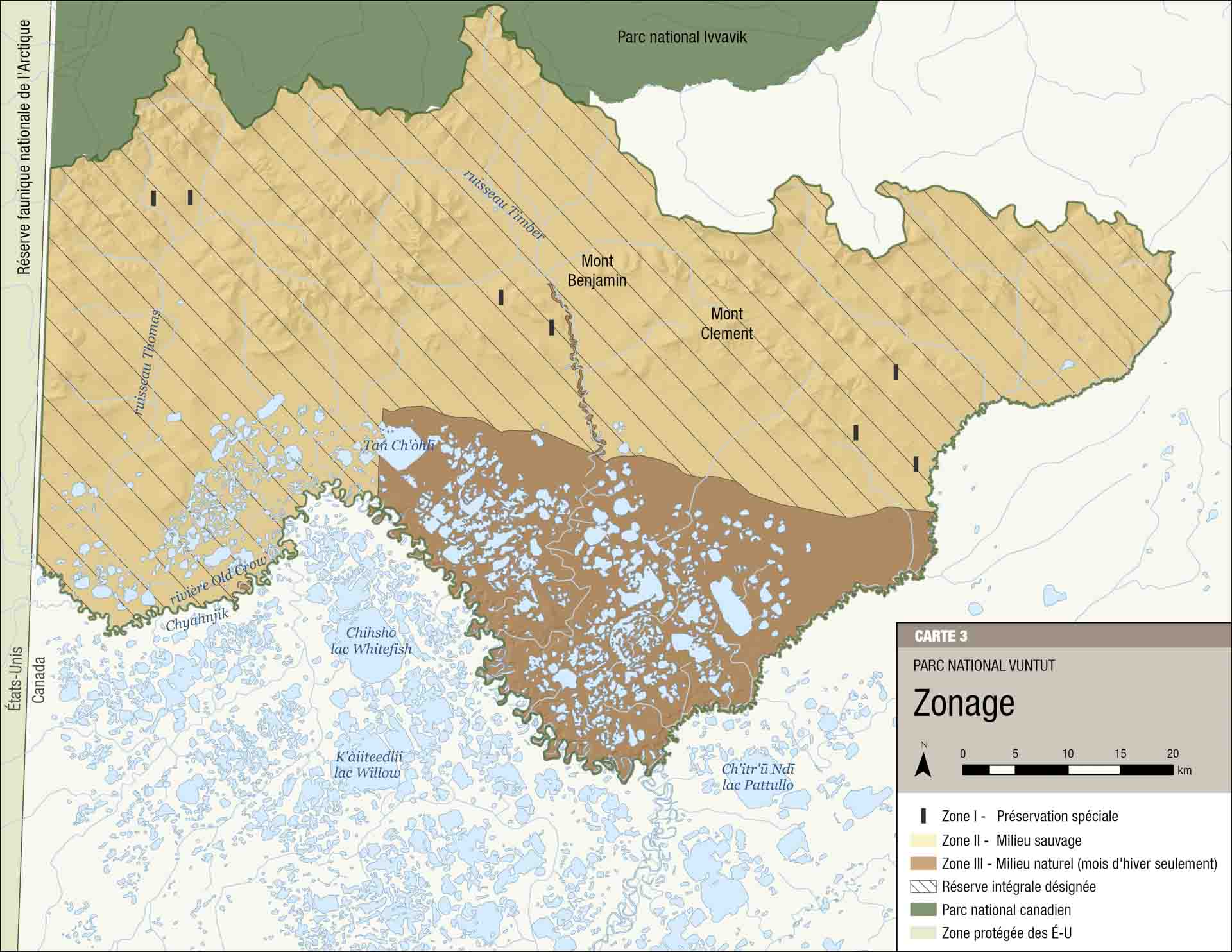 Trois zones de Parcs Canada sont applicables dans le parc national Vuntut (carte 3) :