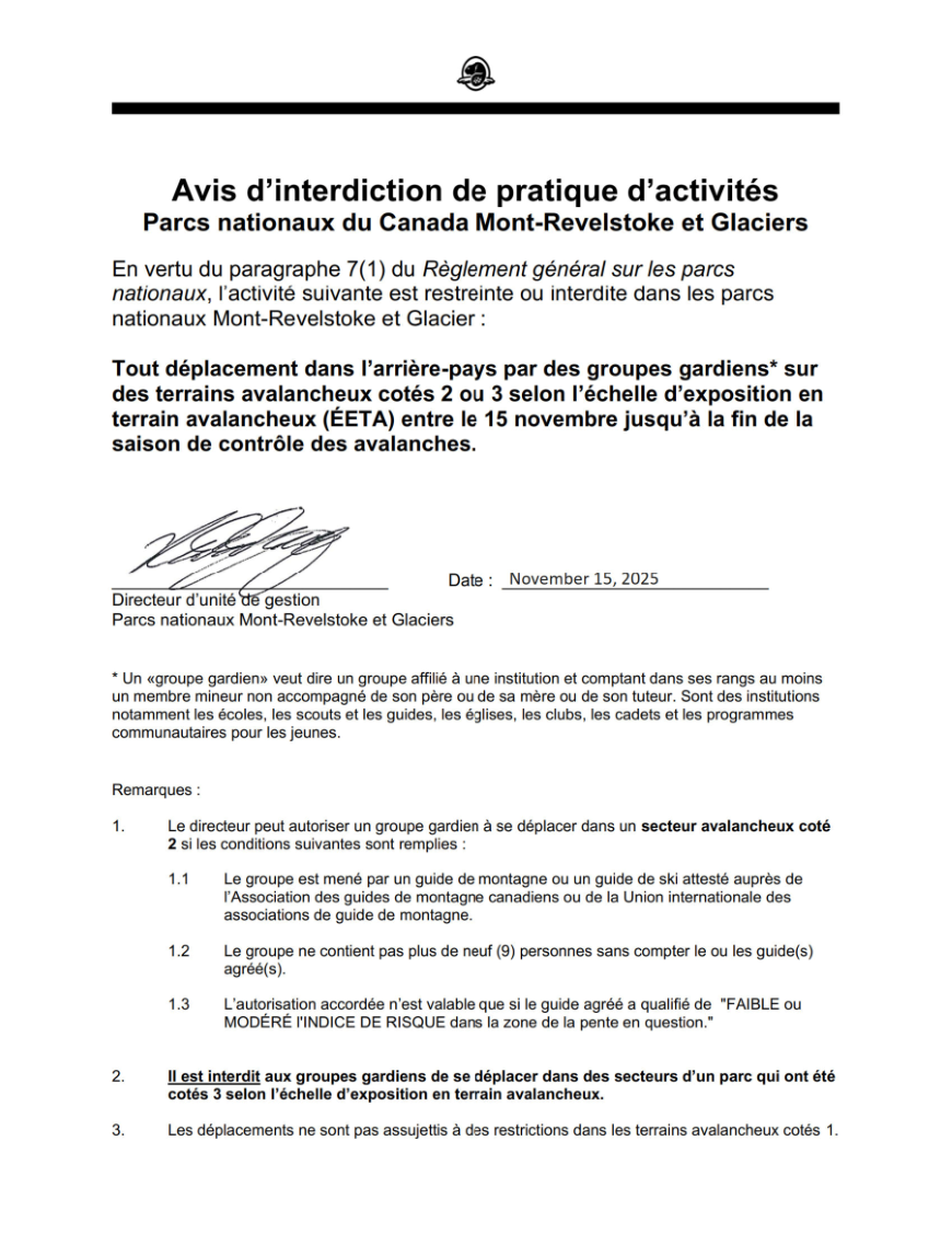 Tout déplacement dans l’arrière-pays par des groupes encadrés* sur des terrains avalancheux cotés 2 ou 3 selon l’échelle d’exposition en terrain avalancheux (ÉETA) entre le 15 novembre jusqu’à la fin de la saison de contrôle des avalanches.