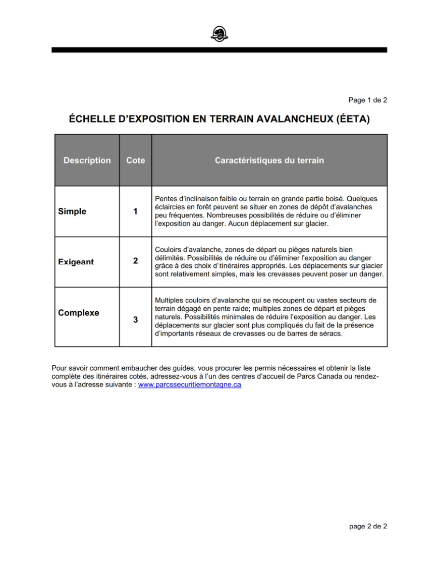 2. Il est interdit aux groupes encadrés de se déplacer dans des secteurs d’un parc qui ont été cotés 3 selon l’échelle d’exposition en terrain avalancheux.