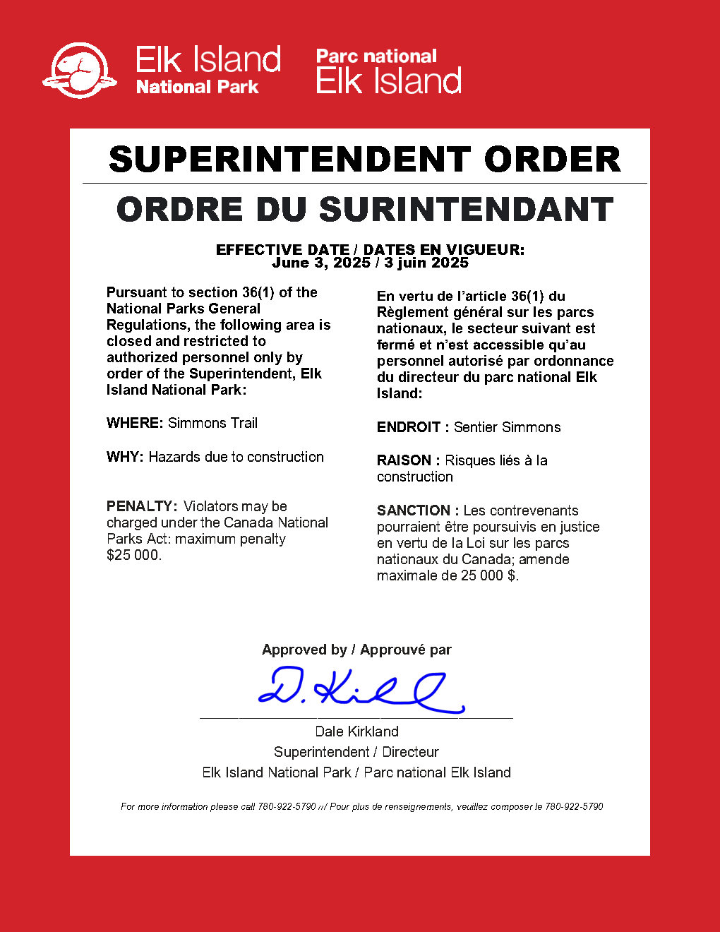 En vertu de l’article 36(1) du Règlement général sur les parcs nationaux, le secteur suivant est fermé et n’est accessible qu’au personnel autorisé par ordonnance du directeur du parc national Elk Island :