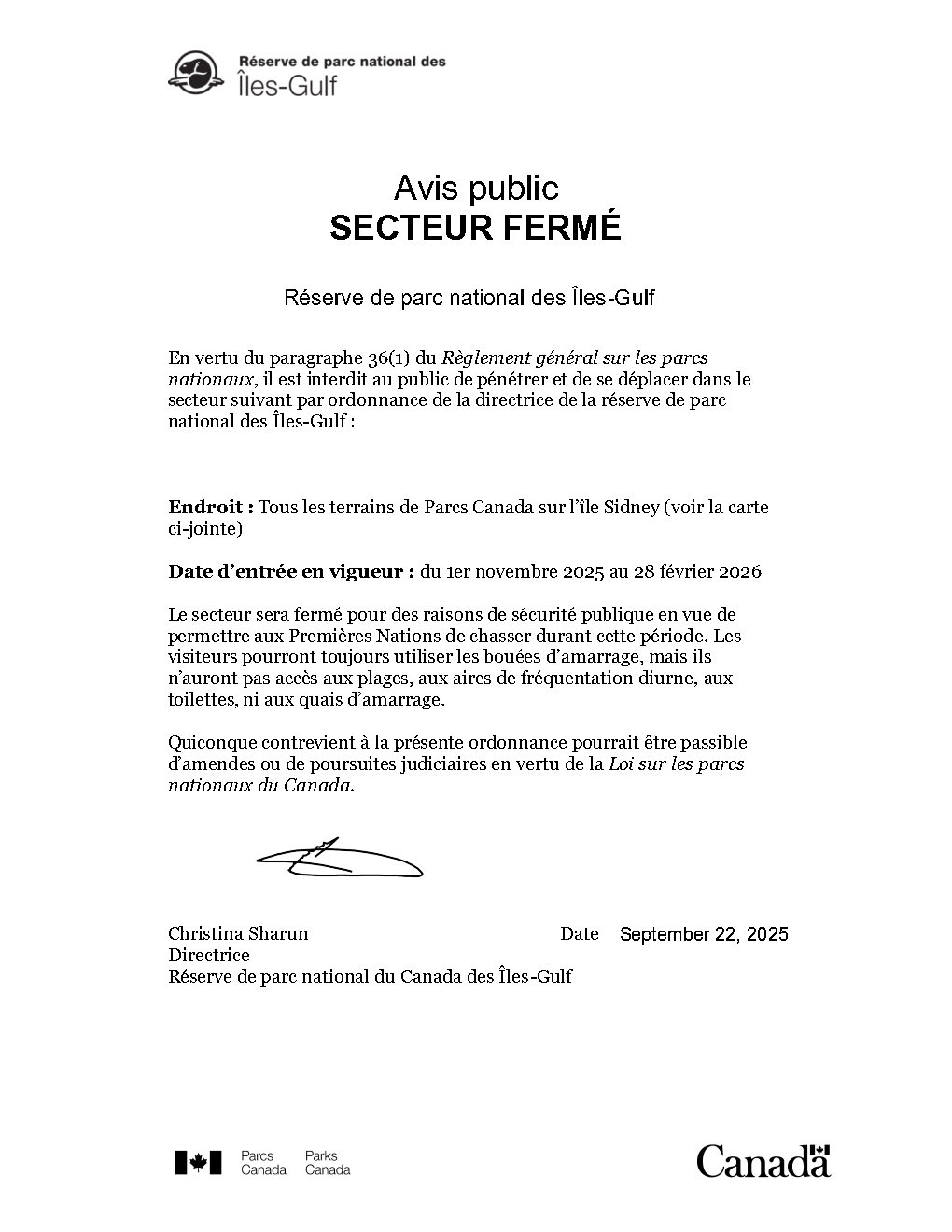 Avis au public: SECTEUR FERMÉ - Île Sidney
