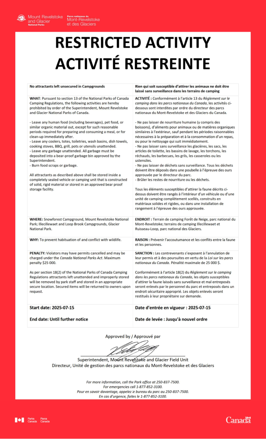 ACTIVITÉ : Conformément à l’article 13 du Règlement sur le camping dans les parcs nationaux du Canada, les activités ci-dessous sont interdites par ordre du directeur des parcs nationaux du Mont-Revelstoke et des Glaciers du Canada.
