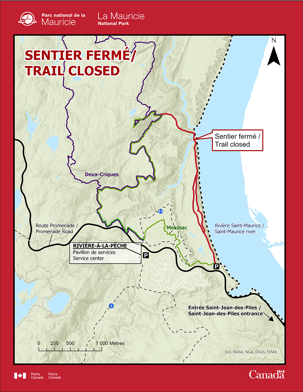 Aux fins du présent avis, une fermeture permanente de la section longeant la rivière Saint-Maurice du sentier du Mekinac, en raison de glissements de terrain et de l’instabilité du sol. Une fermeture de cette section est nécessaire pour assurer la sécurité des visiteurs et elle est inaccessible (voir carte ci-jointe) :