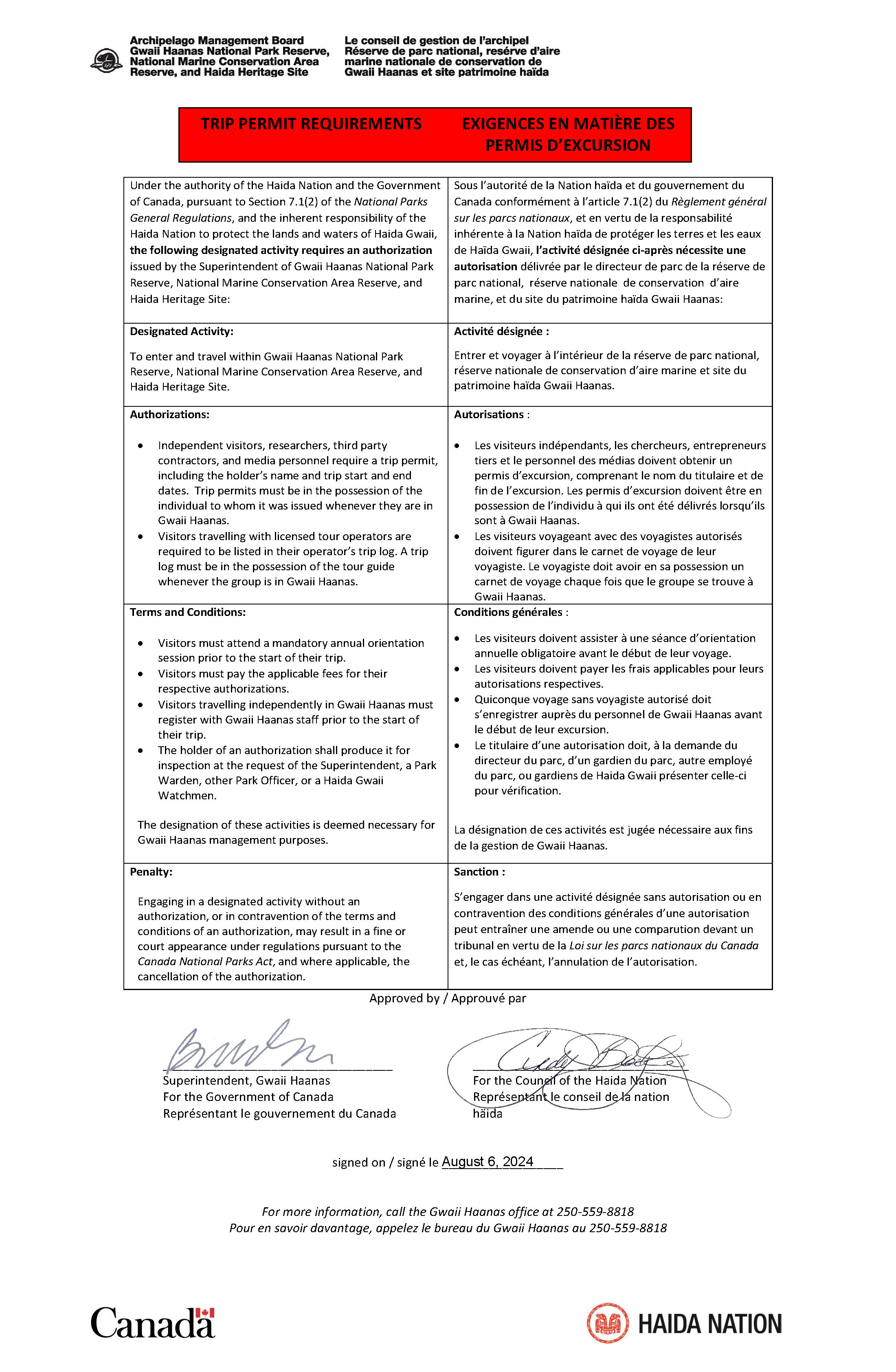 - Les visiteurs indépendants, les chercheurs, entrepreneurs tiers et le personnel des médias doivent obtenir un permis d’excursion, comprenant le nom du titulaire et de fin de l’excursion. Les permis d’excursion doivent être en possession de l’individu à qui ils ont été délivrés lorsqu’ils sont à Gwaii Haanas.