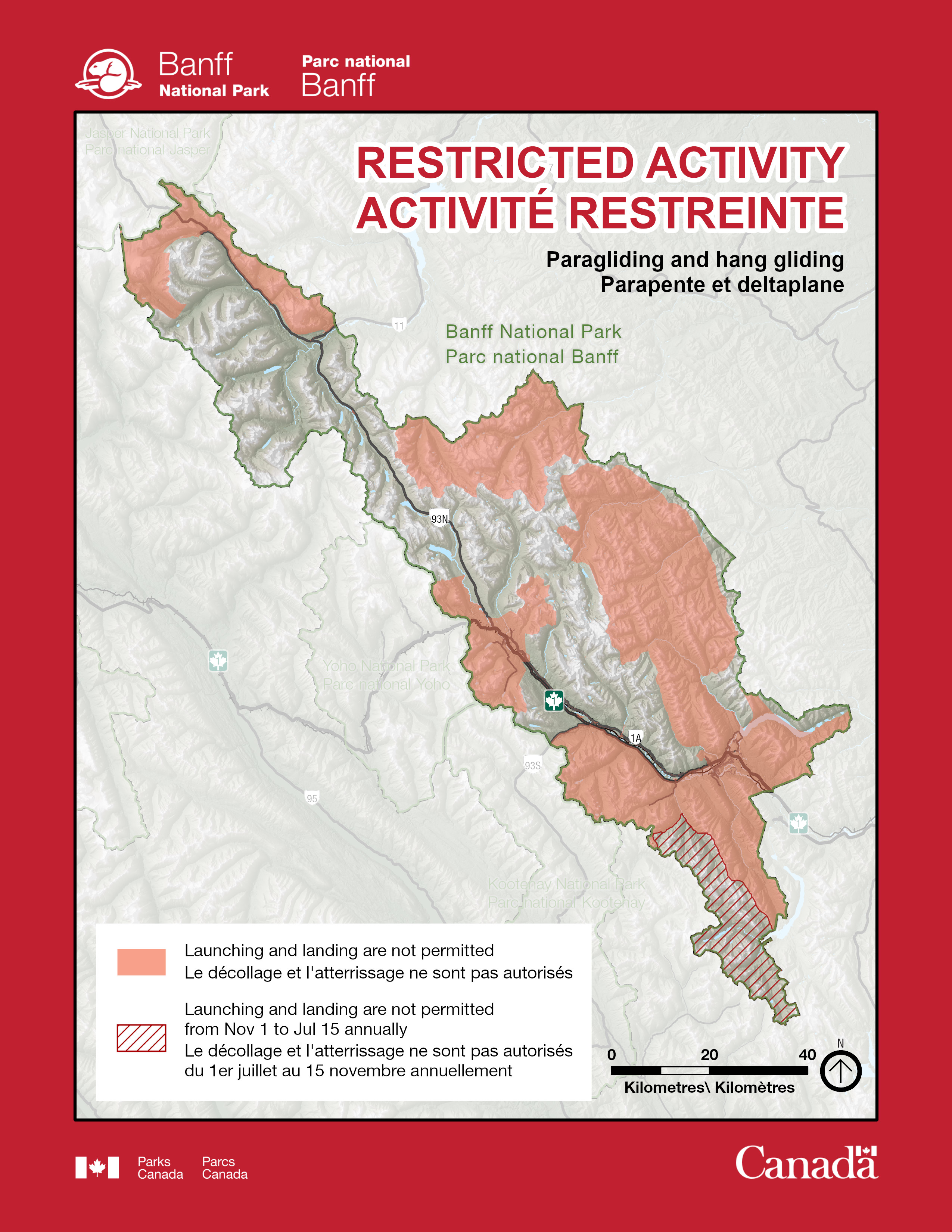 QUOI : En vertu du paragraphe 7(1) du Règlement général sur les parcs nationaux, pris en application de la Loi sur les parcs nationaux du Canada, le directeur restreint ou interdit les activités suivantes : Le décollage et l’atterrissage de vols non motorisés en parapente et en deltaplane, sauf à des moments ou à des endroits précis, dans le respect des conditions établies par Parcs Canada.