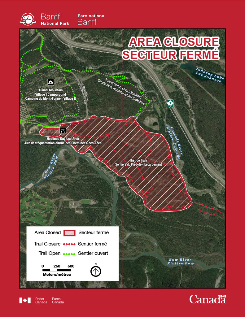 LIEU : Tous les sentiers situés au sud de la route de la carrière Peyto et une petite partie de la côte au nord de la route de la carrière Peyto Pit. La partie ouest de la fermeture commence aux points de départ des sentiers d’interprétation des Cheminées-des-Fées et de la boucle de la Terrasse-Tunnel, situés dans l’aire de fréquentation diurne des Cheminées-des-Fées, ainsi qu’à la jonction des sentiers d’interprétation des Cheminées-des-Fées et de la boucle de la Terrasse-Tunnel.