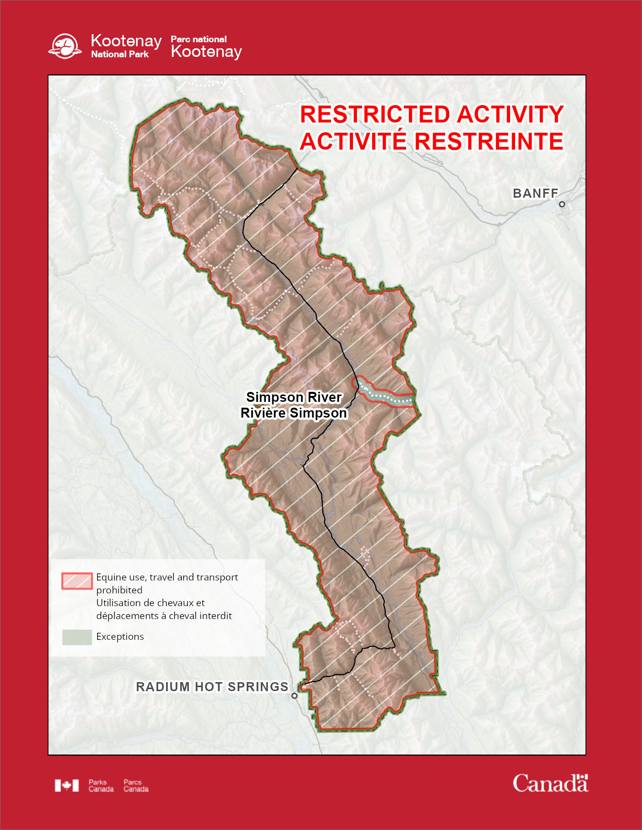 Exception : L’utilisation chevaux est autorisée uniquement sur le sentier de la Rivière-Simpson.