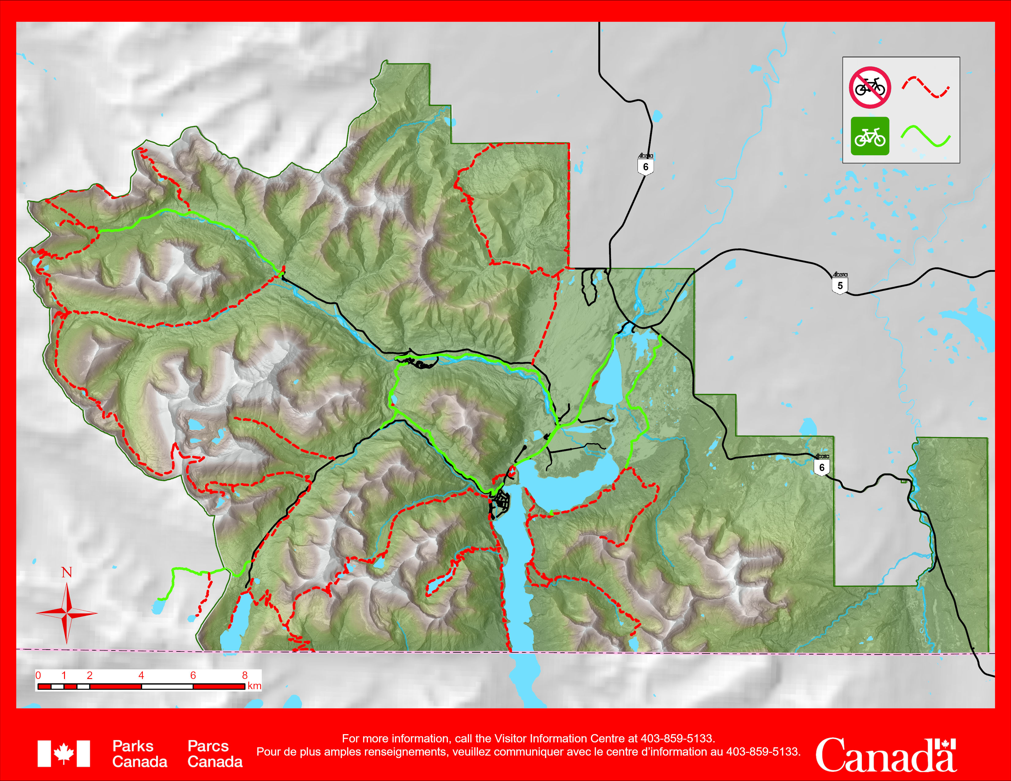 Sur l’ordre du directeur, il est interdit d’avoir un vélo ou de faire du vélo dans les sentiers du parc national du Canada des Lacs Waterton, à l’exception des sentiers suivants (voir la carte ci-jointe) :