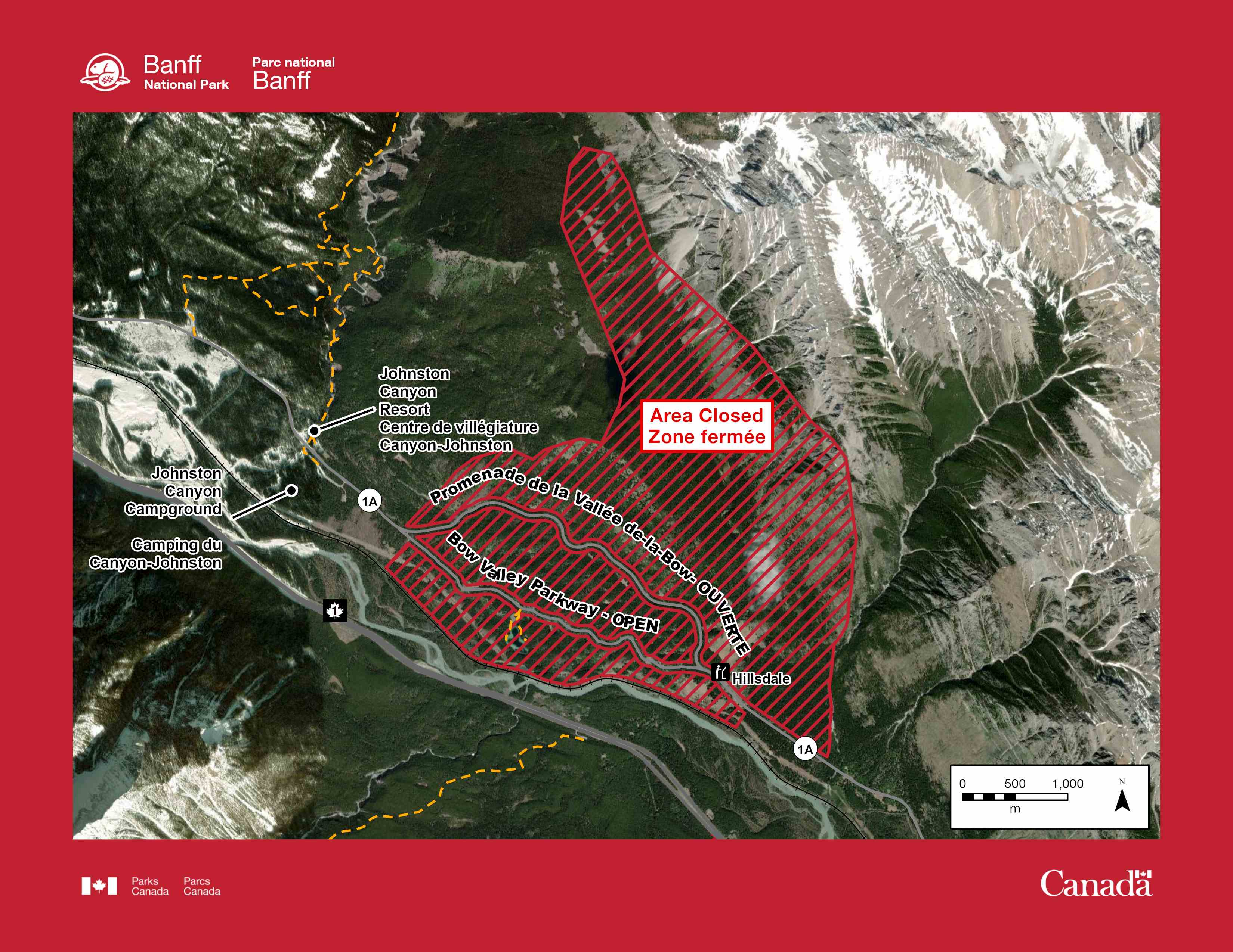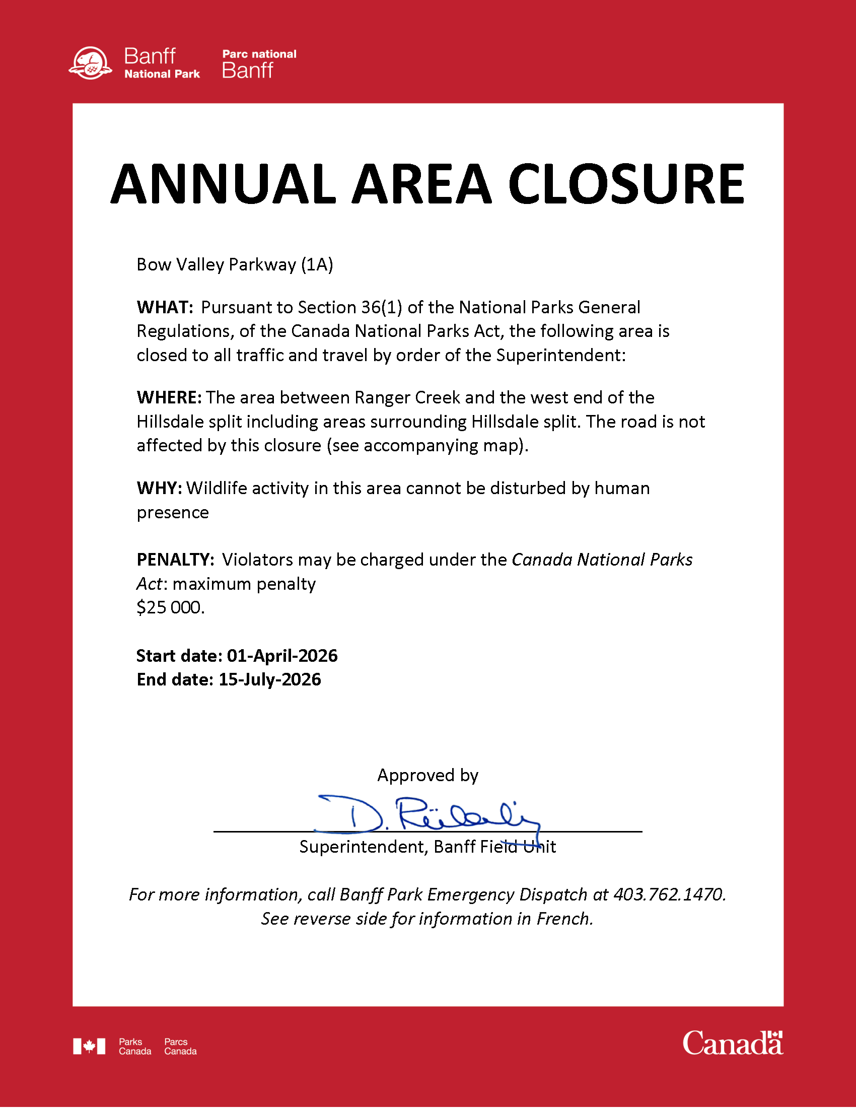 WHAT: Pursuant to Section 36(1) of the National Parks General Regulations, of the Canada National Parks Act, the following area is closed to all traffic and travel by order of the Superintendent: