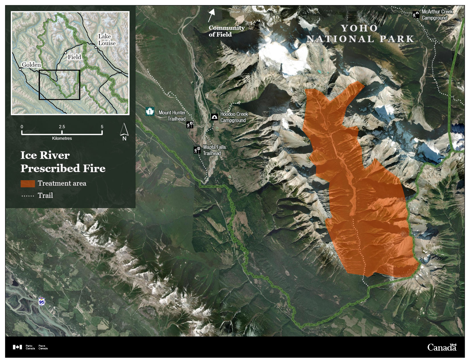 The map shows that the prescribed fire area is northwest Kootenay National Park, and southwest of Field and Lake Louise. Highway 95, Highway 93, and Highway 1 are visible within the regional landscape.