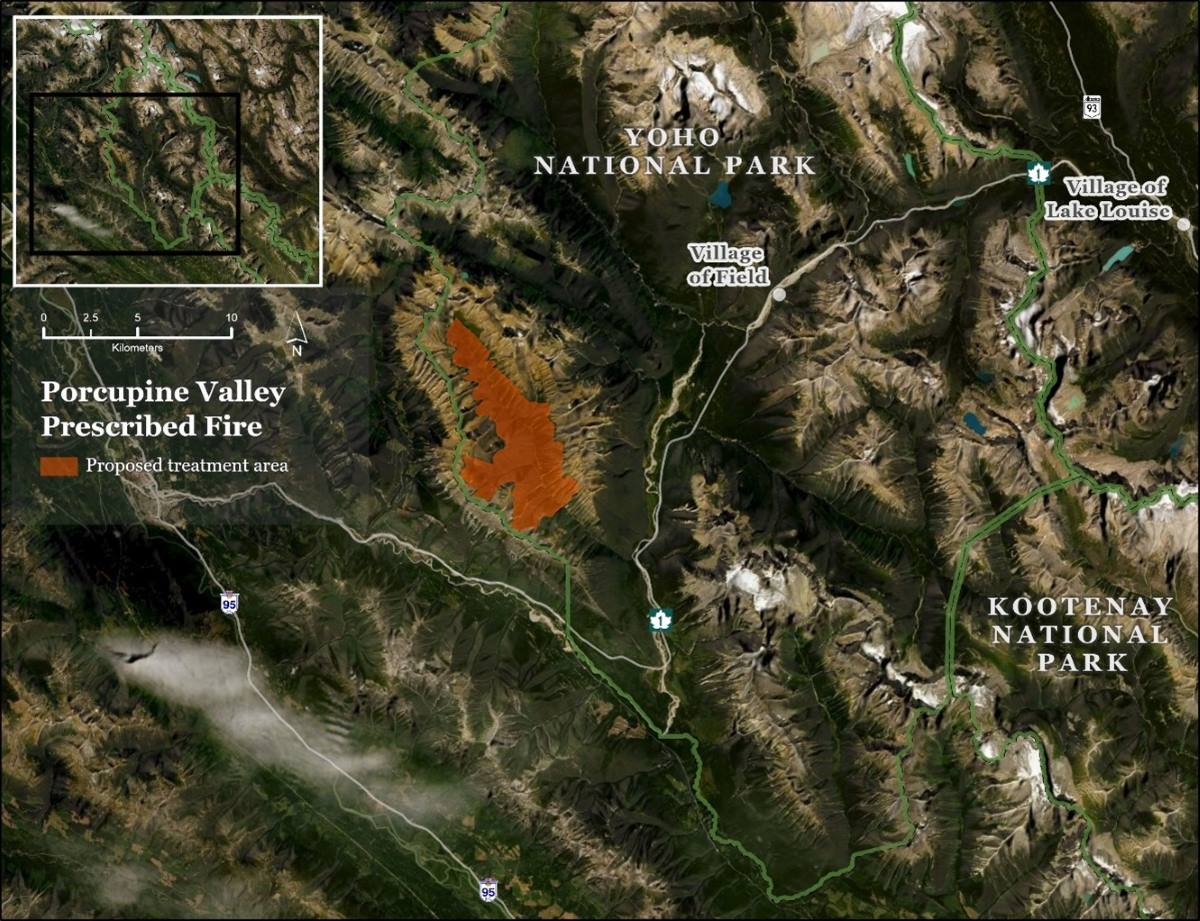 This map shows the Porcupine Valley prescribed fire area in Yoho National Park. The main map shows a satellite-style view. The prescribed fire area is highlighted in orange and is located southwest of Field. It sits in a mountainous, forested valley surrounded by steep peaks and rugged terrain.