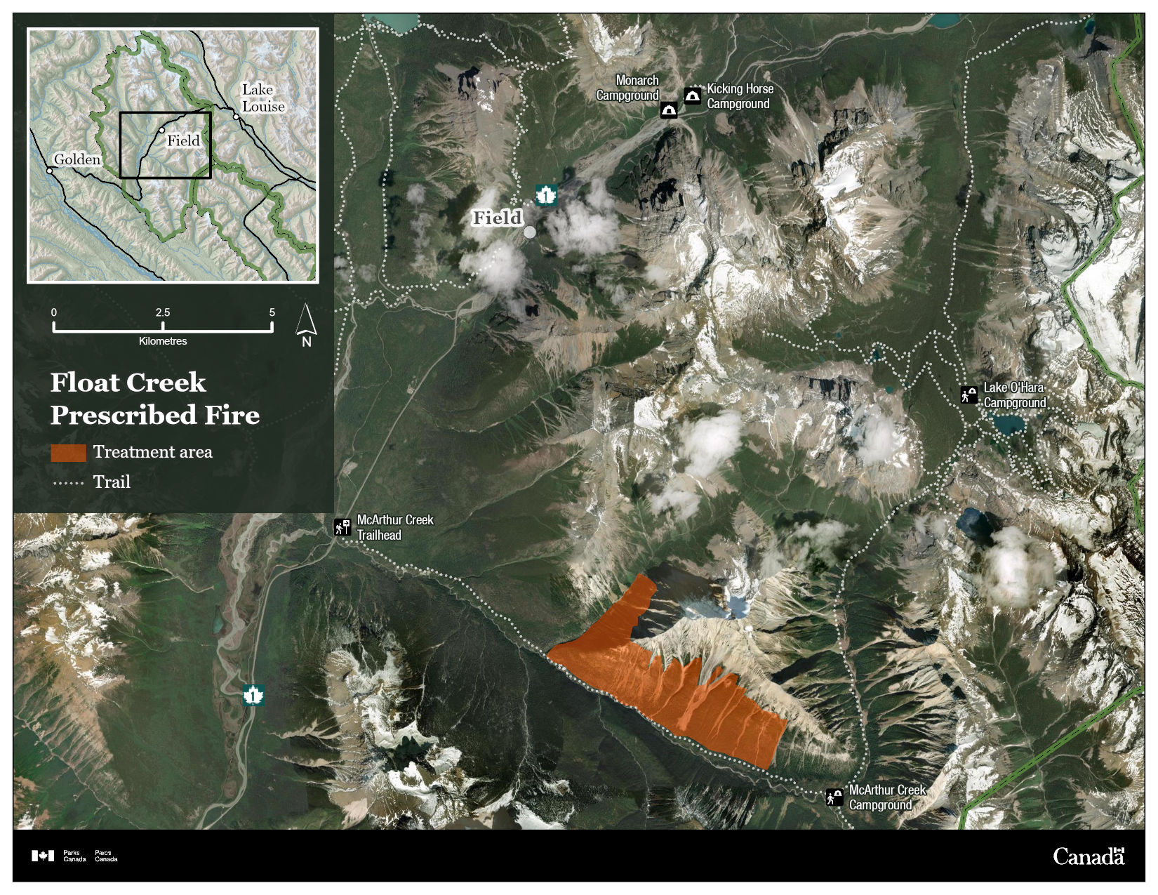 An orange section on the map marks the Float Creek prescribed fire unit. This section is in Ottertail Valley, east of Highway 1, southeast of Lake O’Hara, and south of Field. Dashed lines on the map indicate trails. This includes routes leading toward locations such as the McArthur Creek trailhead, McArthur Creek Campground, and Lake O’Hara Campground. Additional landmarks—such as Monarch and Kicking Horse campgrounds—are marked to help situate the prescribed fire area within the broader landscape.